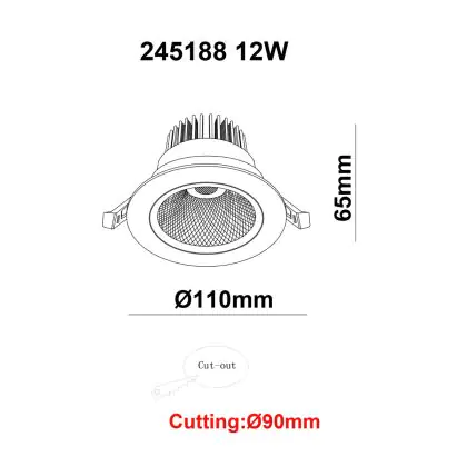 | Fabrikantnaam | White label LED Downlight Round Tiltable 12W 960lm 60D 930 UGR19 CutoutØ90mm FrameØ110mm | |